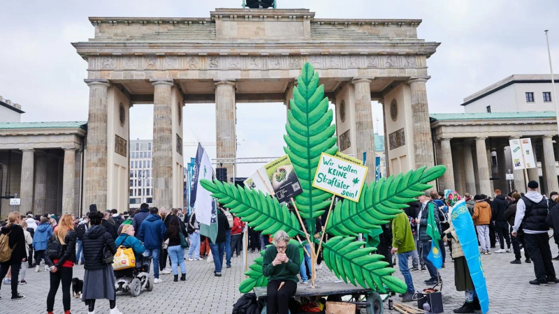В полночь люди собрались у Бранденбургских ворот в Берлине, чтобы «покурить», таким образом приветствовав новые правила, которые были введены после горячих дебатов о плюсах и минусах облегчения доступа к каннабису.