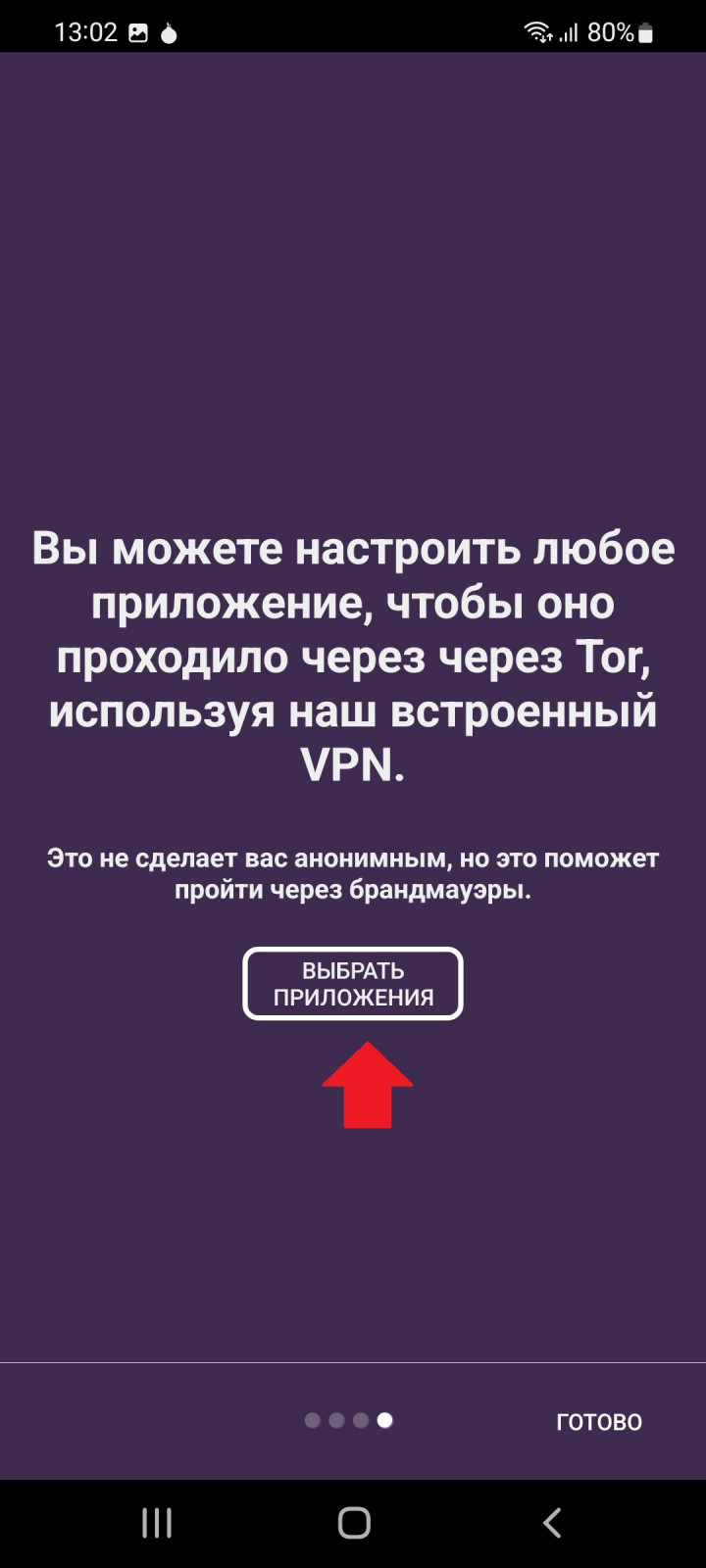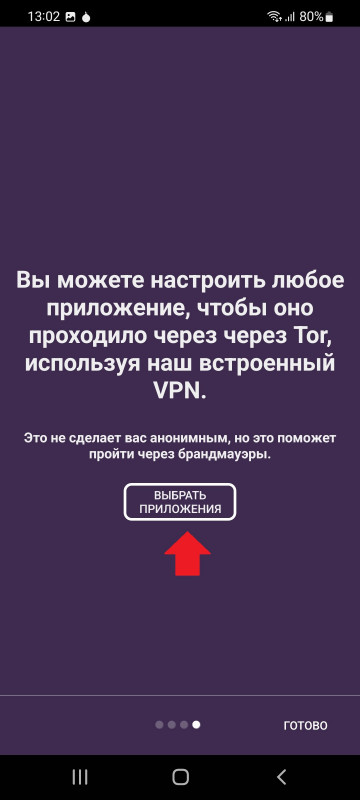 На следующем шаге нам предложат выбрать приложение или приложения (например инсту можно так же пустить через орбот и она будет работать), которое у нас будет работать в сети ТОР.