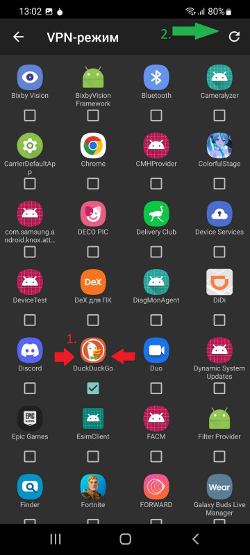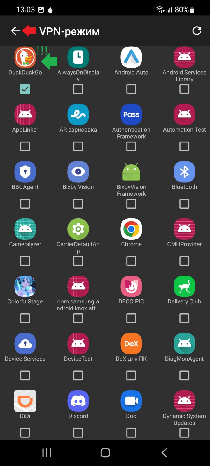 Далее мы видим список наших установленных на смартфон приложений, среди всей этой кучи нам нужно отыскать DuckDuckGo.