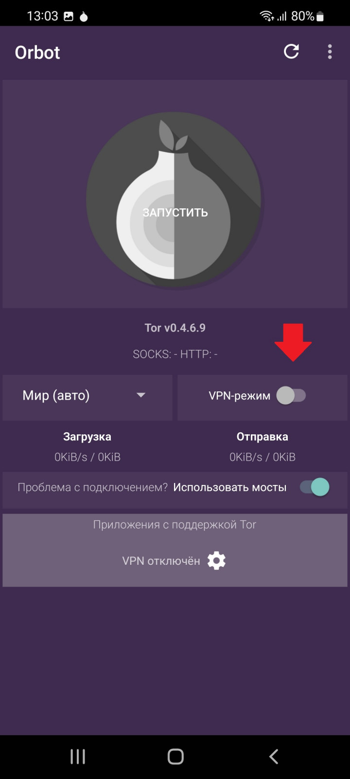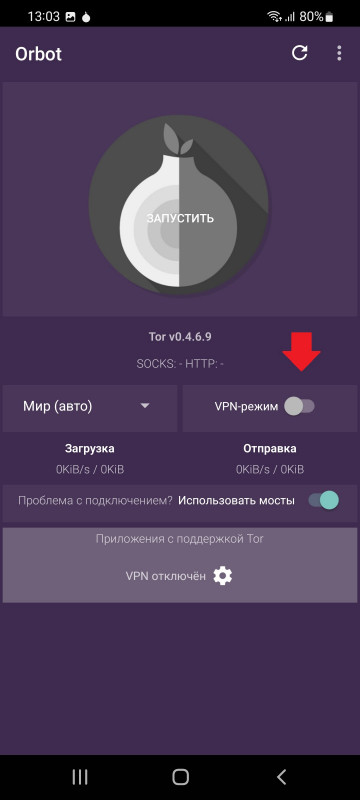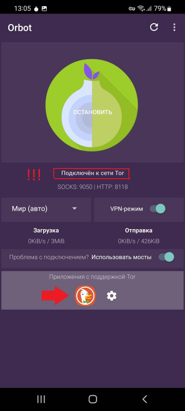 После того как установили оба приложения, заходим в Orbot.