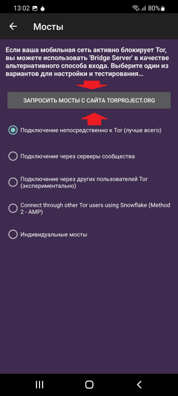 На этом шаге мы нажимаем "запросить мосты с сайта torproject.org"