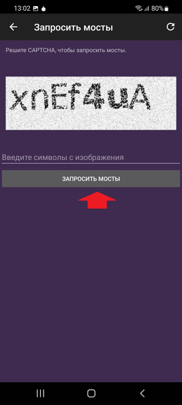 После того как нажали,вводим капчу и жмём на "запросить мосты"
