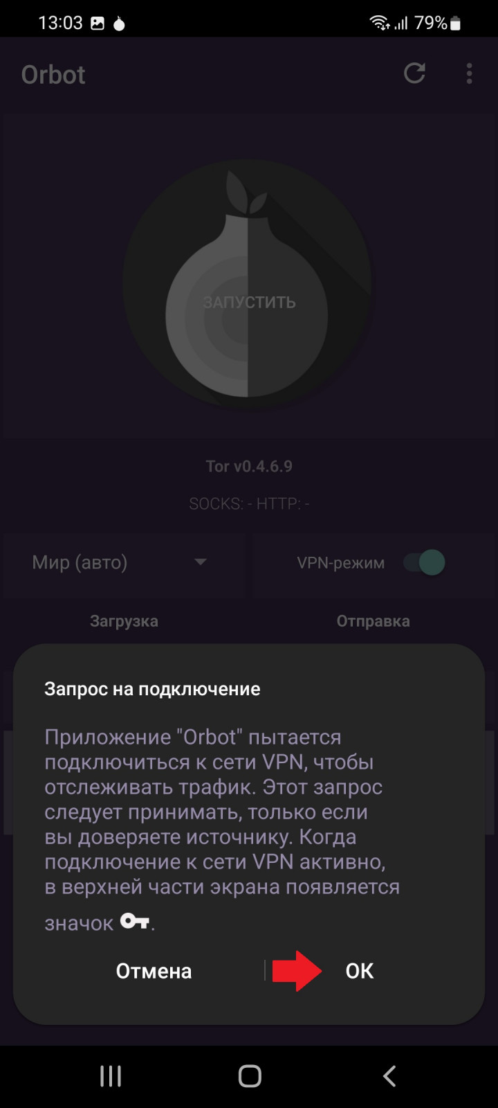 После сего действия, нам покажет следующее: нам говорится о том, что Орбот хочет подключиться к сети vpn, а нам это и нужно! Соглашаемся кнопкой "ок".