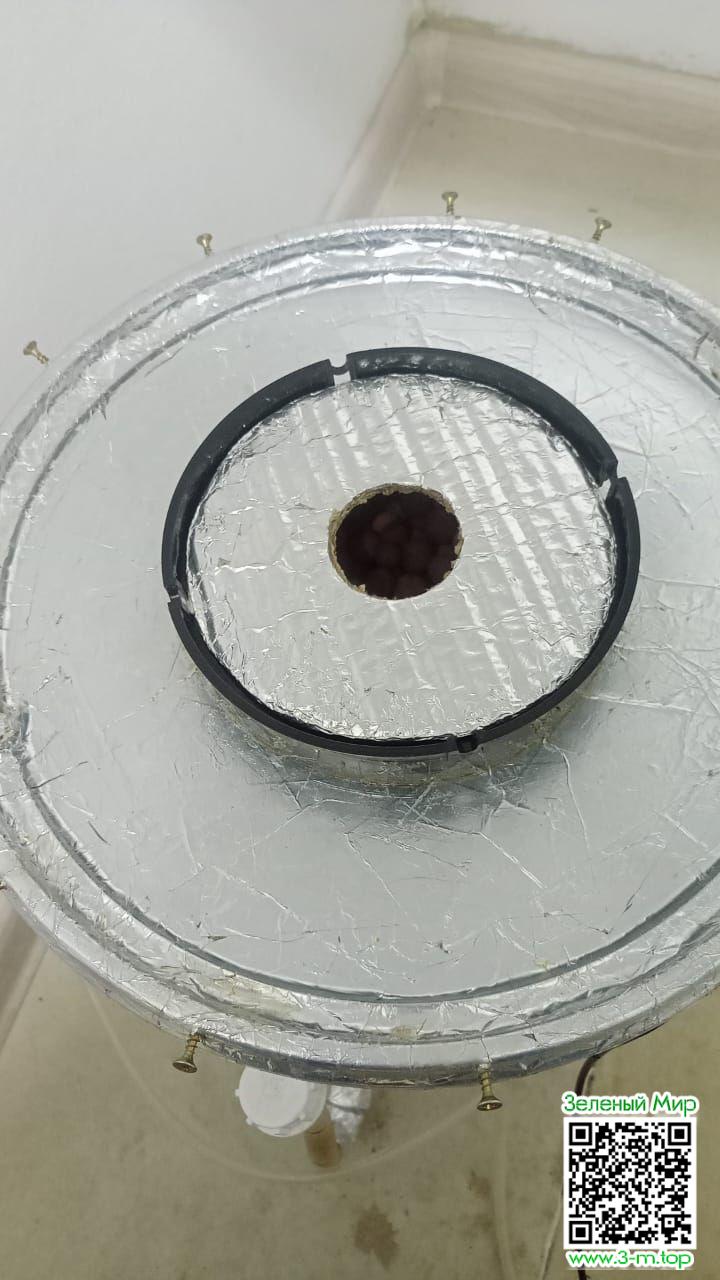 Так как керамзит засыпан не полностью, свет будет попадать в раствор, а это нам очень как не нада! По этому, чтоб он падал только на росток, делаем под размер горшочка диск из картона с отверстием в центре 30мм, оклеиваем алюминиевым скотчем и закрываем сверху. Нам нужно, чтоб росток вытянулся выше верха сетчатого горшка на 1см, чтоб полностью засыпать керамзитом и исключить попадания света в раствор. Для этого нужно регулировать освещенность. А чтоб наверняка, я использую всё ту же лампу на 60W на расстоянии в 50-70 см от ростка. Если через сутки росток не вытянулся, нужно увеличить расстояния до 1м. По мере вытягивания подсыпаем аккуратно керамзит, чтоб не повредить хрупкий росток, так же, под семядоли. Как только росток стал выше горшочка и керамзит засыпан по края, диск можно убрать и опустить лампу до 30-40 см.