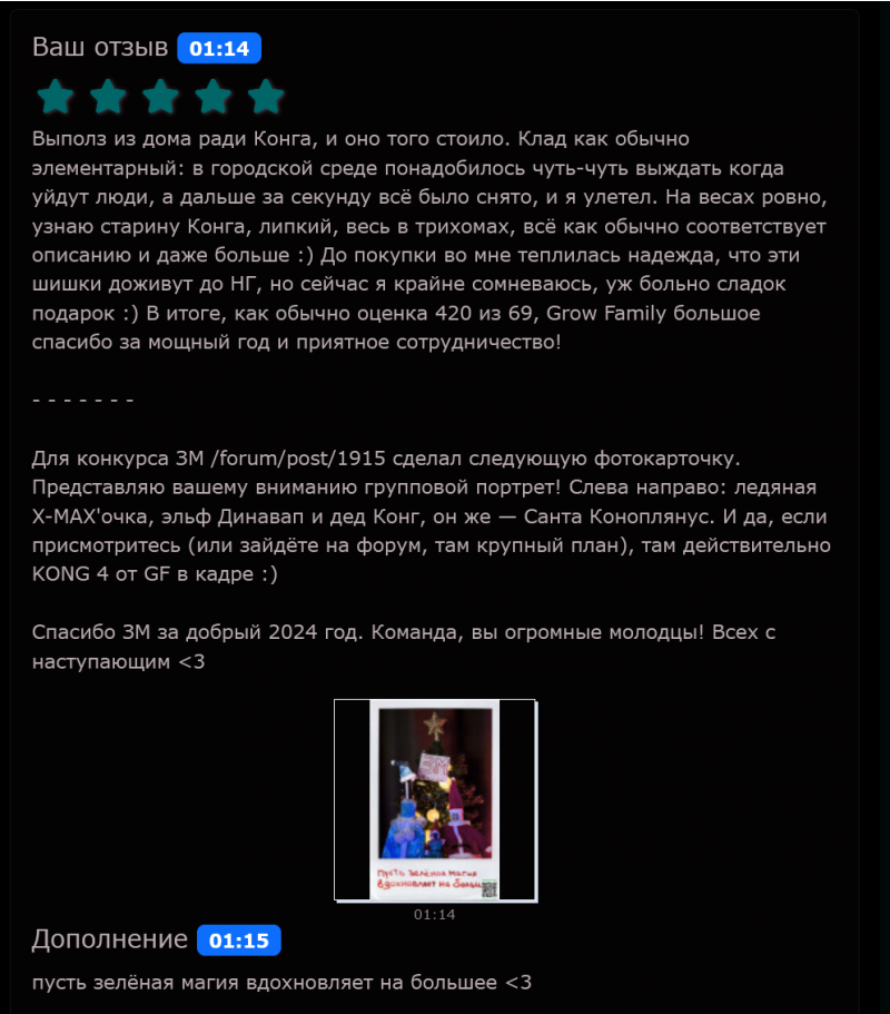 Всех с наступающим! Оставил отзыв на покупку 344268, и подготовил для ЗМ фотокарточку. Представляю групповой портрет, слева направо: ледяная X-MAX'очка, эльф Динавап и дед Конг, он же — Санта Коноплянус (да, там буквально шишка).
