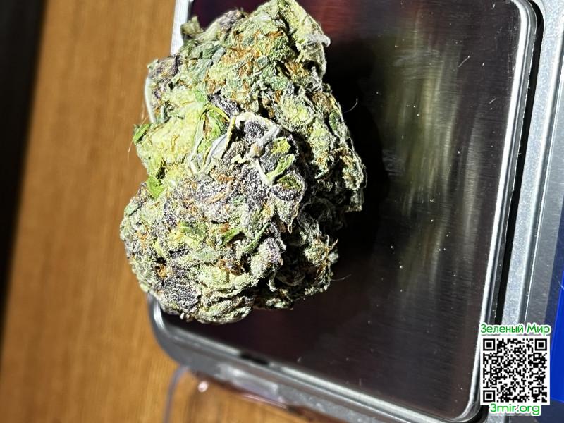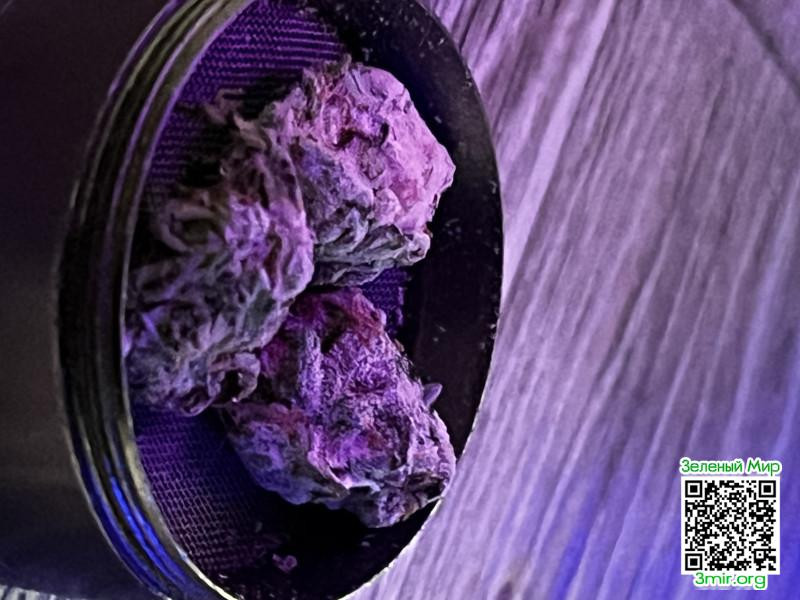 Тёмная, плотная, собранная. Фиолетовый цвет доминирует, зелень лишь местами. Смолистость читается сразу, шишка выглядит «тяжёлой» и монолитной.