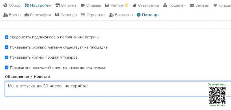 Чтобы ваши клиенты не переживали и знали что у вас происходит, магазинам добавлена возможность писать объявление, которое показывается на всех страницах магазина и товаров.