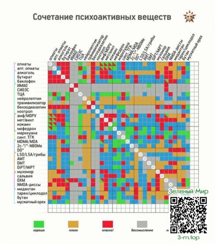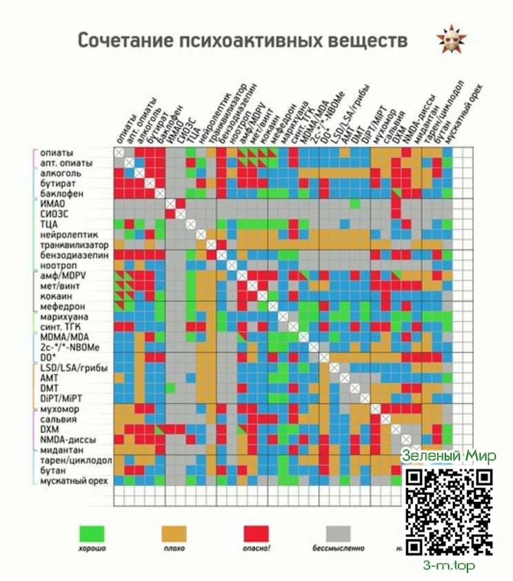 да, это реально мысль что показывают внутреннею проблему в тебе. А по поводу таблички, много таких видел и много ошибок в каких то пишут что сиозс классно(зеленый квадрат) смешивать с мдма, в твоей что типа тца можно с мдма мешать, хотя совершенно нельзя чтоб не словить серотониновый синдром. И по поводу транков они замедляют прохождение импульсов в нейронах и ослабляют эффектов, это не спидбол чтоб качели устраивать, хотя может и правда устраивают раздрай в голове и качели появляются опасные для здоровья, жаль что я не обладаю достаточными знаниями в биохимии чтоб грамотно рассуждать об этом