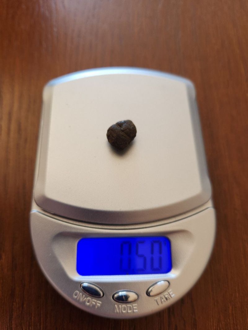 В упаковке встретил меня довольно тёмный гашиш, в количестве пол грамма ровно, судя по весам. Запах явный, но не сильно резкий, тяжеловато-смолянистый, тёплый летний аромат смол каннабиса, при ближайшем рассмотрении также отдаёт хвоей, итоговая вонючесть примерно 6.5/10, тот же KINI, как по мне, воняет ощутимо больше.
