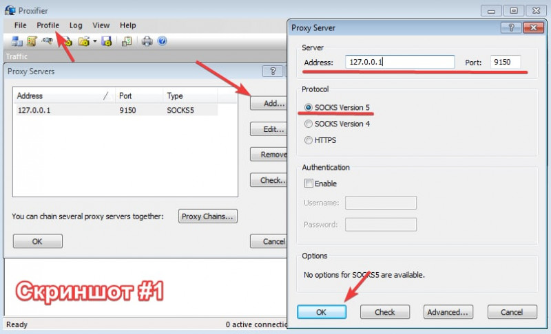 В поле Address указать 127.0.0.1, в поле Port указать 9150, Protocol выбрать Socks5 и нажать ОК. (см. скрин #1)