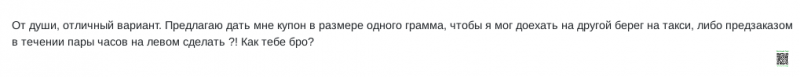 Бро, он сказал сделай купон мне в грамм (то есть бесплатно), или за два часа пред на левом(что очень трудно в реализации). Ты если здесь не видишь грубостей - это у тебя что-то с восприятем.