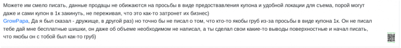 GrowPapa, Да я был сказал - дружище, в другой раз) но точно бы не писал о том, что кто-то якобы груб из-за просьбы в виде купона 1к. Он не писал тебе дай мне бесплатные шишки, он даже об объеме необходимом не написал, а ты сделал свои какие-то выводы поверхностные и начал писать, что якобы он с тобой был как-то груб)