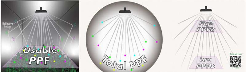 - PPF (фотосинтетический поток фотонов) - является количественным измерением производимого лампой PAR в единицу времени. Измеряется в микромолях в секунду (мкмоль/с). Можно сказать, что PPF - это реальная мощность источника света.