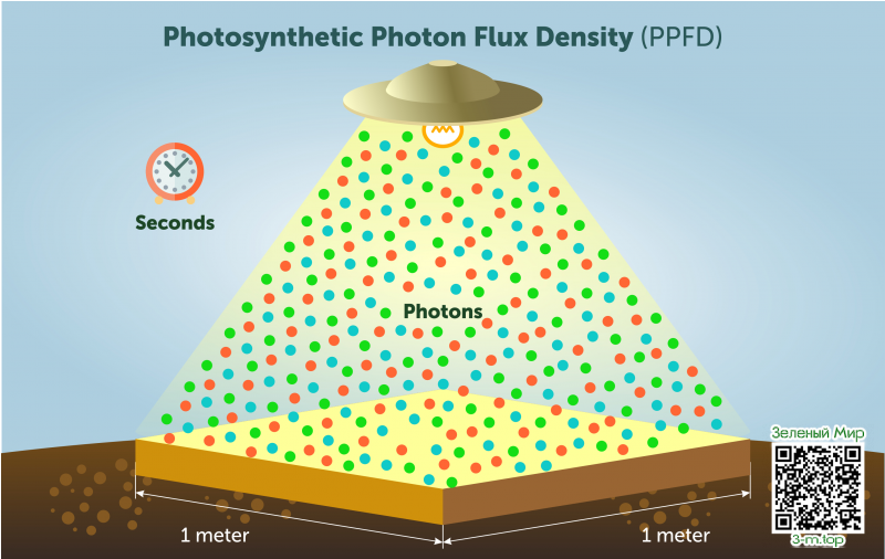 - PPFD (плотность потока фотосинтетических фотонов) - показатель, отображающий реальное количество полезного света, который ваше растение получает за единицу времени. Он измеряется в микромолях на квадратный метр в секунду (мкмоль/м 2/с)