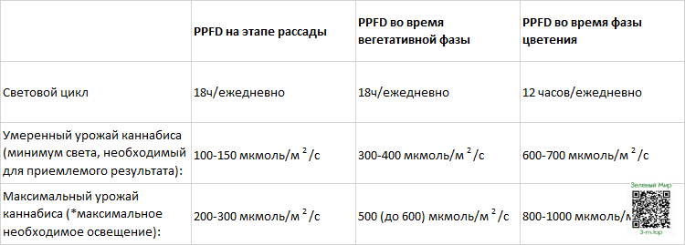 *Опытные гроверы могут использовать различные лайфхаки, которые позволяют ещё более повышать уровень PPFD без вреда для растения. Например, добавление углекислого газа в камеру для выращивания. Однако, подобные техники следует использовать с осторожностью, чтобы не создать переизбыток света.