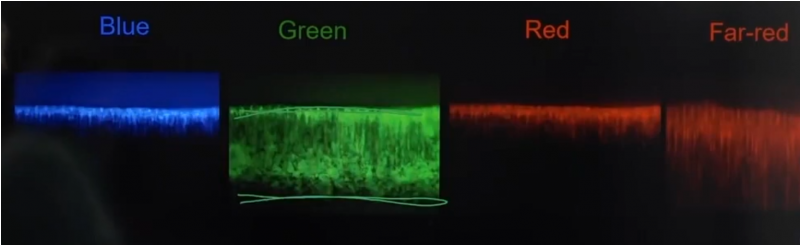 Как видно на изображении выше, не только зеленый свет обладает хорошей проникающей способностью, но и дальний красный (это диапазон света между красным и инфракрасным, примерно 710—800 нм).