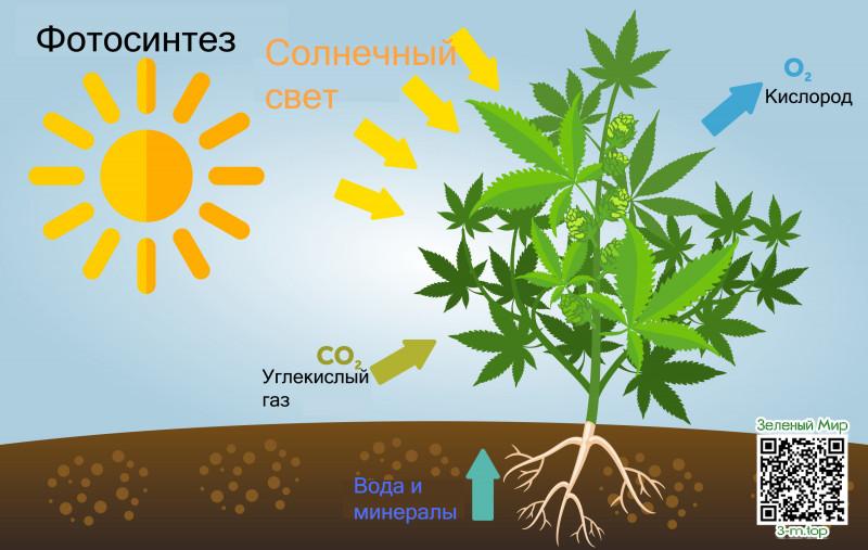 В процессе своего роста каннабис (как и многие другие зеленые растения) преобразует световое излучение, углекислый газ и воду в строительный материал для собственного организма. Кислород выделяется в качестве побочного продукта этого процесса.