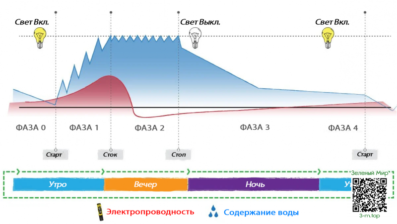 Для эффективного применения высокочастотной фертигации необходимо следовать определенному графику. В течении ночного времени субстрат должен в достаточной мере просыхать, а сток не должен вытекать слишком быстро. Вы можете использовать более простые схемы, однако, многофазный график показал себя в качестве самого эффективного варианта.