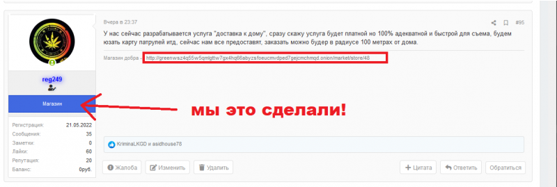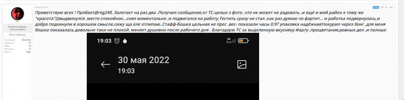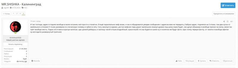 И так вчем общий салам.) Сегодня находясь на форуме я, нашёл новый магазин. От души что записали, адрес выдали быстро, как и просил дали город. Сам адрес поднял чётко, быстро и без проблем. Работа курьера просто огонь. Упаковка тоже отлично, ну пакеты конечно большеваты хахаха можно поменьше) Не долга думая закалачиваю сигарету, и сразу пошёл на улицу. После того как хапнул убило очень сильно, да так что меня начало прижимать к полу хахах в глазах всё стало дрожать и плыть и тут я знатно ахренела. С трудом нашёл лавочку, сел на неё и просидел без движения минут 30 я так дико залип что потом кое как одну ногу с другой ноги спустил на землю ззахаха. Когда немного пропустила вызвал такси и полетел до дома. Дома сделал два водных и всё на кровать после такова трудного дня но прекрасным вечером мне всё очень понравилось.)